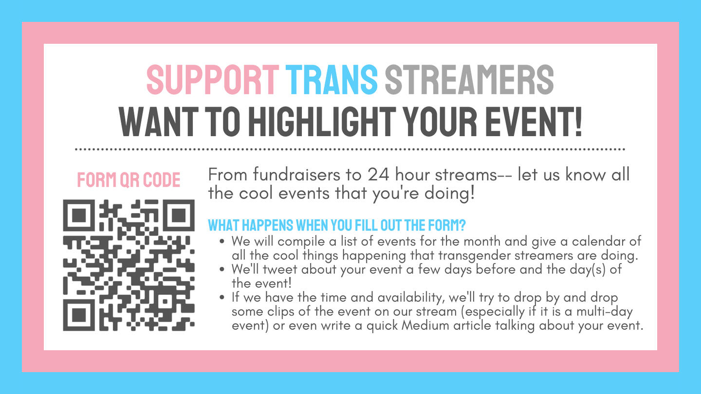 Do you have an upcoming event happening this month? A fundraiser, a stream-aton, or even just a 24 hour stream? Well, Support Trans Streamers wants to help your advertisement of the event and to highlight it when it happens!